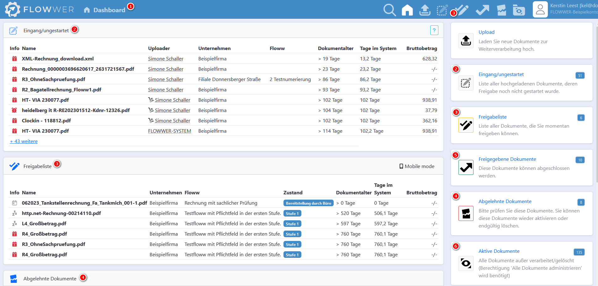 Das Dashboard dient als zentrales Werkzeug zur unternehmensübergreifenden Übersicht aktiver Dokumente.