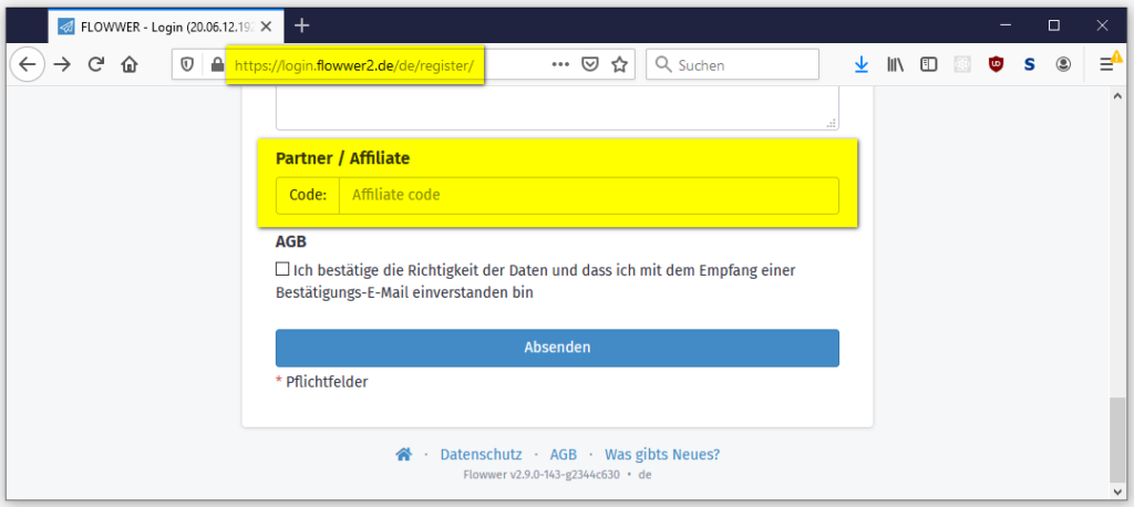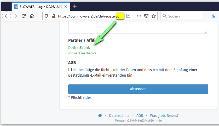 Vorbelegung der Partner-ID über die Adresse (URI) des Anmeldeformulars. Die URI des Anmeldeformulars lautet “https://login.flowwer.de/de/register/" wobei “/dnf” (im Bild) durch die tatsächliche Partner-ID ersetzt werden muss.
