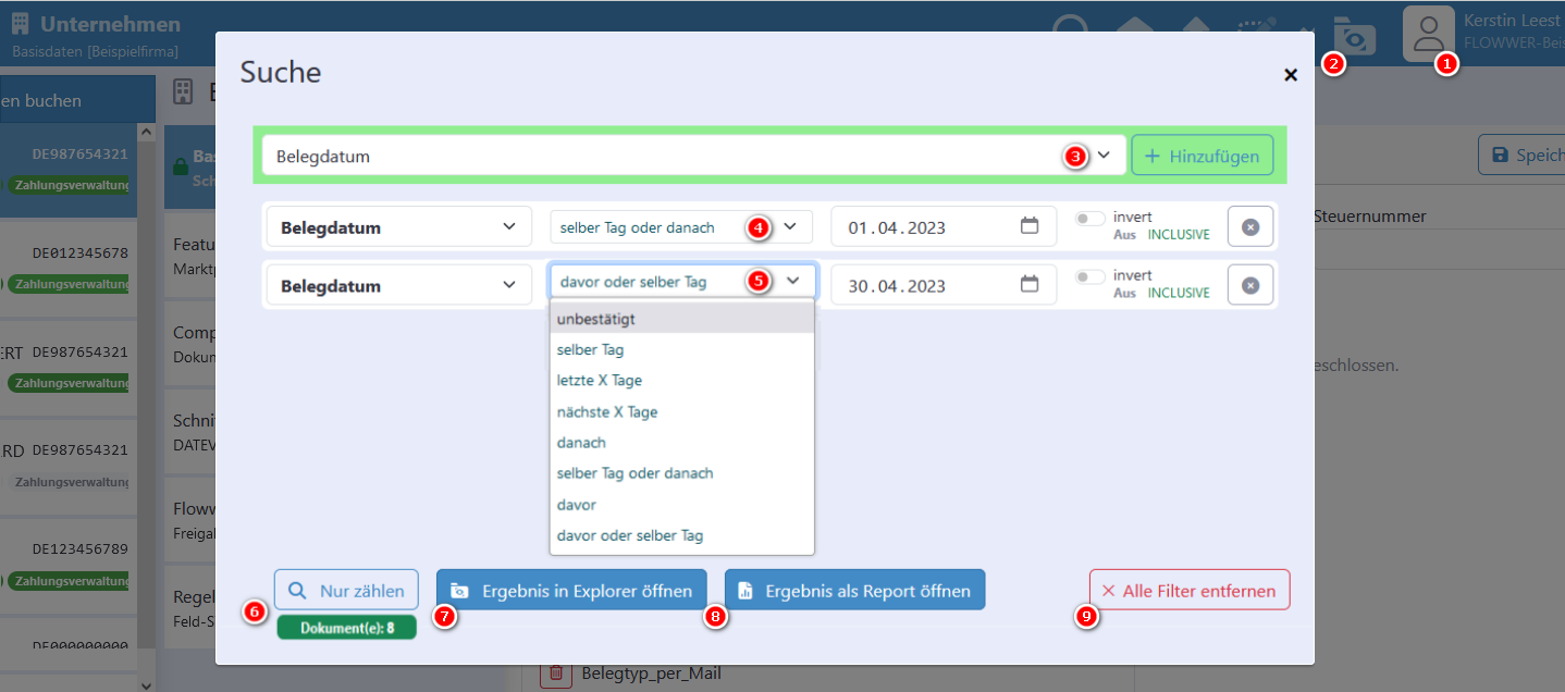 In FLOWWER ist es möglich, nach Belegen/Dokumenten und dessen Inhalten bzw. Eigenschaften zu suchen. Nach Login (1) und Auswahl der Firma (hier Beispielfirma) ist der Explorer (2) das Mittel der Wahl. Um z.B. Belege von 01.04.2023 bis einschließllich 30.04.2323 zu filtern (3), muss der Filter “Belegdatum” doppelt gesetzt werden. Es ist technisch (momentan) nicht möglich, direkt einen Zeitraum (von…bis…) zu erstellen, so dass zwei Datumspunkte - der Startzeitpunkt - und das Ende des Zeitraumes - zu selektieren sind.