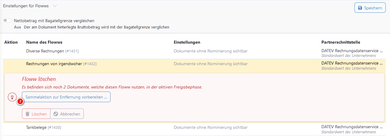 Damit der Floww gelöscht werden kann, müssen zuvor alle noch zugewiesenen Dokumente gelöst werden.