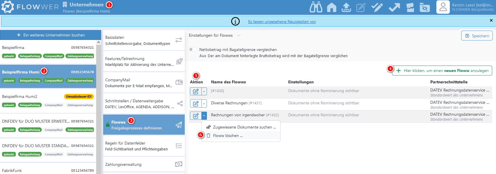 Durchgeführt wird der Vorgang mittels einer Sammelaktion, welche im Bereich “Einstellungen für FLOWWS” vorbereitet (7) wird.