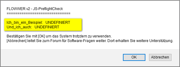 Das hat zur Folge, dass FLOWWER nicht oder nicht fehlerfrei ausgeführt wird. Im gelb hinterlegten Teil der Meldung sind die fehlenden Programmteile aufgelistet.