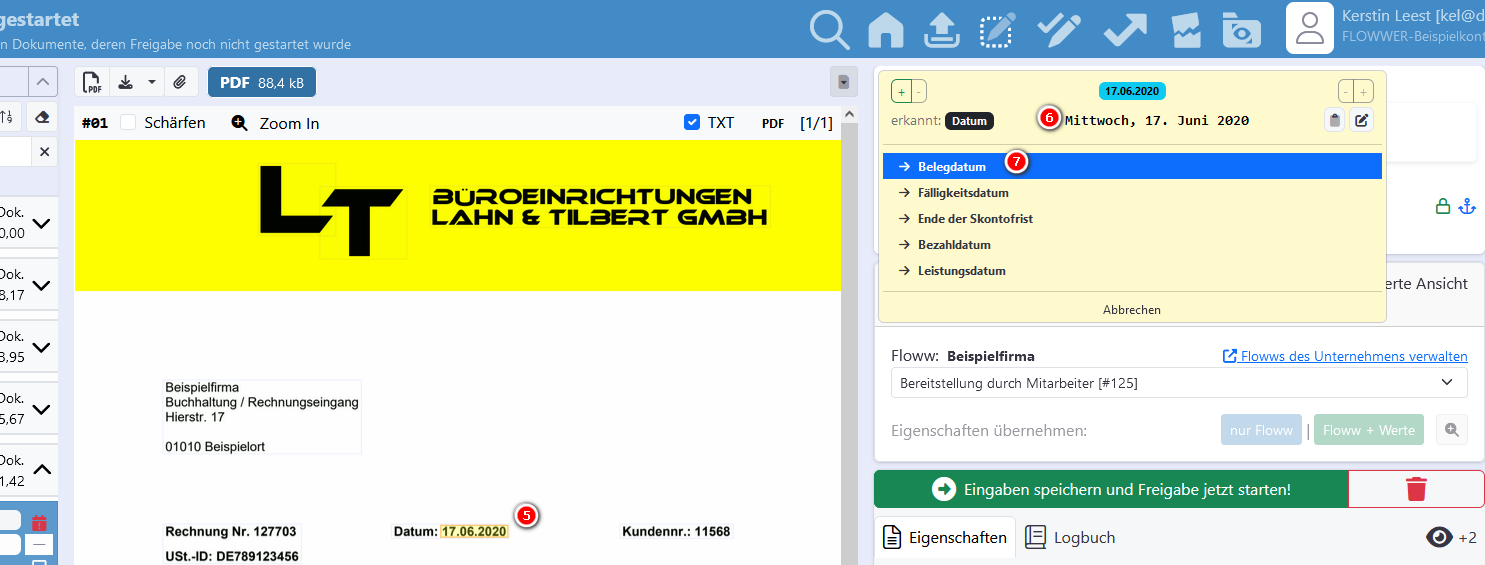 Das Training der OCR erfolgt durch die Nutzung der Eingabehilfe bei der Belegbearbeitung. Je häufiger diese verwendet wird, desto präziser wird die Texterkennung. Wenn die Maus über ein Textelement des Belegs bewegt wird, zeigt FLOWWER den erkannten Text grün hinterlegt an. Wird das Element per Mausklick ausgewählt, bietet FLOWWER passende Datenfelder der Belegeigenschaften an. Der Benutzer entscheidet, welches Feld dem Text zugeordnet wird (z. B. „Belegdatum“). FLOWWER übernimmt das Datum und lernt gleichzeitig die Position des Datums für zukünftige Belege desselben Lieferanten.