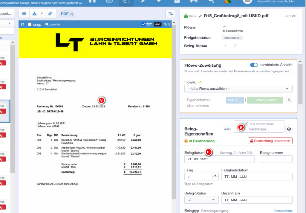 Wird ein weiterer Beleg desselben Lieferanten hochgeladen, erkennt FLOWWER den Lieferanten sowie das zuvor angelernte Datum und trägt es automatisch ein.