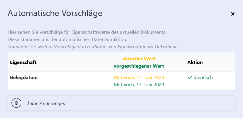 Alle erkannten Daten werden zur Kontrolle und möglichen Korrektur nochmals angezeigt. Die Option „Automatische Vorschläge“ ermöglicht es, die extrahierten Daten zu überprüfen und gegebenenfalls anzupassen, wodurch das OCR-Training weiter verfeinert wird.